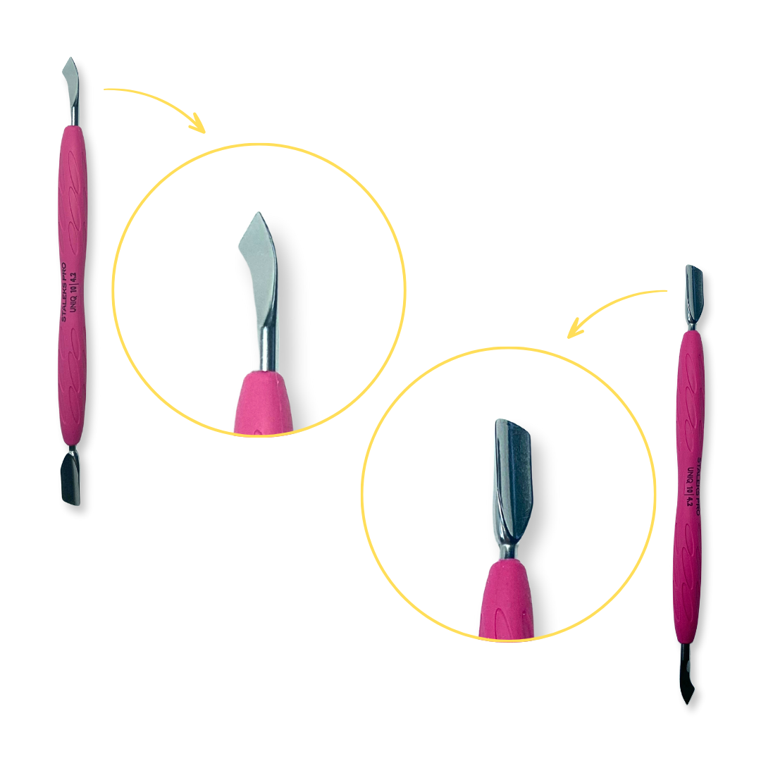 Com suas pontas bem definidas e de alta precisão, a espátula é perfeita para empurrar, levantar e remover cutículas delicadamente, além de preparar a superfície das unhas para esmaltação, alongamentos ou outros tratamentos.